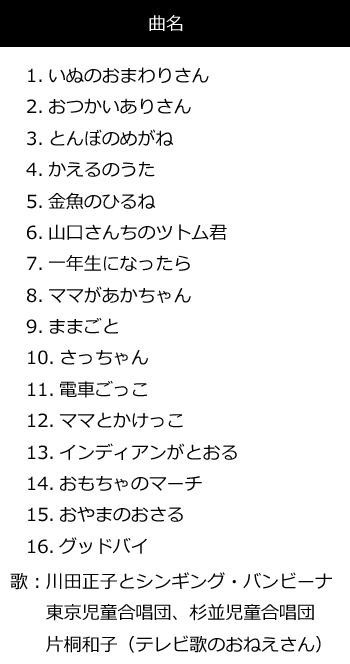 「いぬのおまわりさん」「おつかいありさん」「とんぼのめがね」他、子供から大人まで、みんなに愛される定番の童謡がはいったアルバムです!
