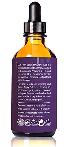 Ultimate Hydrating Serum Hyaluronic Acid moisturizer serum for skin rejuvenation - this anti aging wrinkle serum delivers results! As we age, the moisture content in our skin drops significantly, which makes skin lose elasticity and exposes the signs of aging. Hyaluronic gel serum plays a critical role in skin health with its unique ability to hold in moisture and hydrate your skin. One of the best Hyaluronic acid benefits is that it protects from UVB rays which are skin damaging. Organic hyaluronic acid is high in potency and will deliver nourishment & moisture to skin to make it radiate and glow in appearance. Stimulate collagen production and restore healthy moisture levels to your skin with this advanced anti aging serum. Suitable for all skin types, including dry, oily, combination, normal, damaged, sensitive and breakout and acne prone skin. Hyaluronic acid skin serum will deliver unmatched moisture results! Our 72% Organic Hyaluronic acid face serum is an instant skin hydrator while enhancing, firming, tightening, lifting, and brightening skin. To create a broad and effective skin care regimen, use a cleanser to remove dirt and oils from the face. After cleansing, use toner to prepare skin for serum, oil, lotion, and cream absorption. Hyaluronic acid vitamin c serum and retinol serum make for a great anti-aging serum duo. For further hylaron benefits, apply an anti wrinkle cream, hyaluronic acid cream, or a moisturizer with hyaluronic acid after serum application. Our Hyaluronic Acid liquid Serum is made with Certified Organic ingredients (72%) and is 100% Vegan for the highest potency. Paraben, Alcohol, and Fragrance Free. This hyaluronic lotion serum is formulated with a lightweight, fast-absorbing solution full of antioxidants to soften and nourish skin and act as a hyaluronic filler. Professional hyaluronic acid exfoliator serum, enriched with anti-aging Vitamins C E and Green Tea. SAY GOODBYE TO face lines and wrinkles, dark circles and puffy eyes.Feature