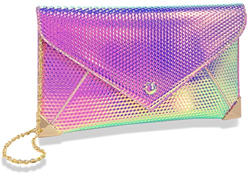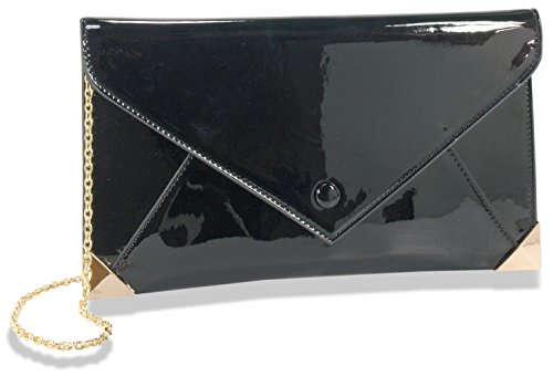 Product Description Beautiful patent, envelope style clutch. It can be worn as a shoulder bag with its detachable chain shoulder strap (22.5in drop length) Metal edge hardware complete the look. 0
