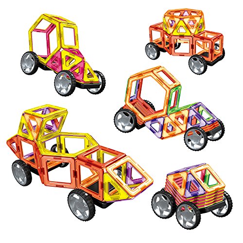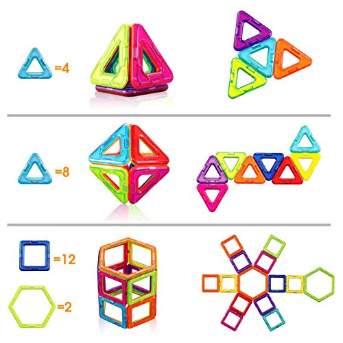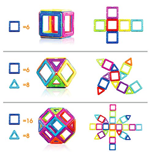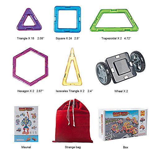 【High quality & Affordable】: Totally 50pcs:including18*Triangular,24*Square,2*Hexagon,2*Isosceles triangle,2*Trapezoid,2*Wheel. 2 different random colors on each side of each magnetic tile. Magnet does not have polarity of S pole and N pole, it can rotate 360 degrees, let's combine freely.