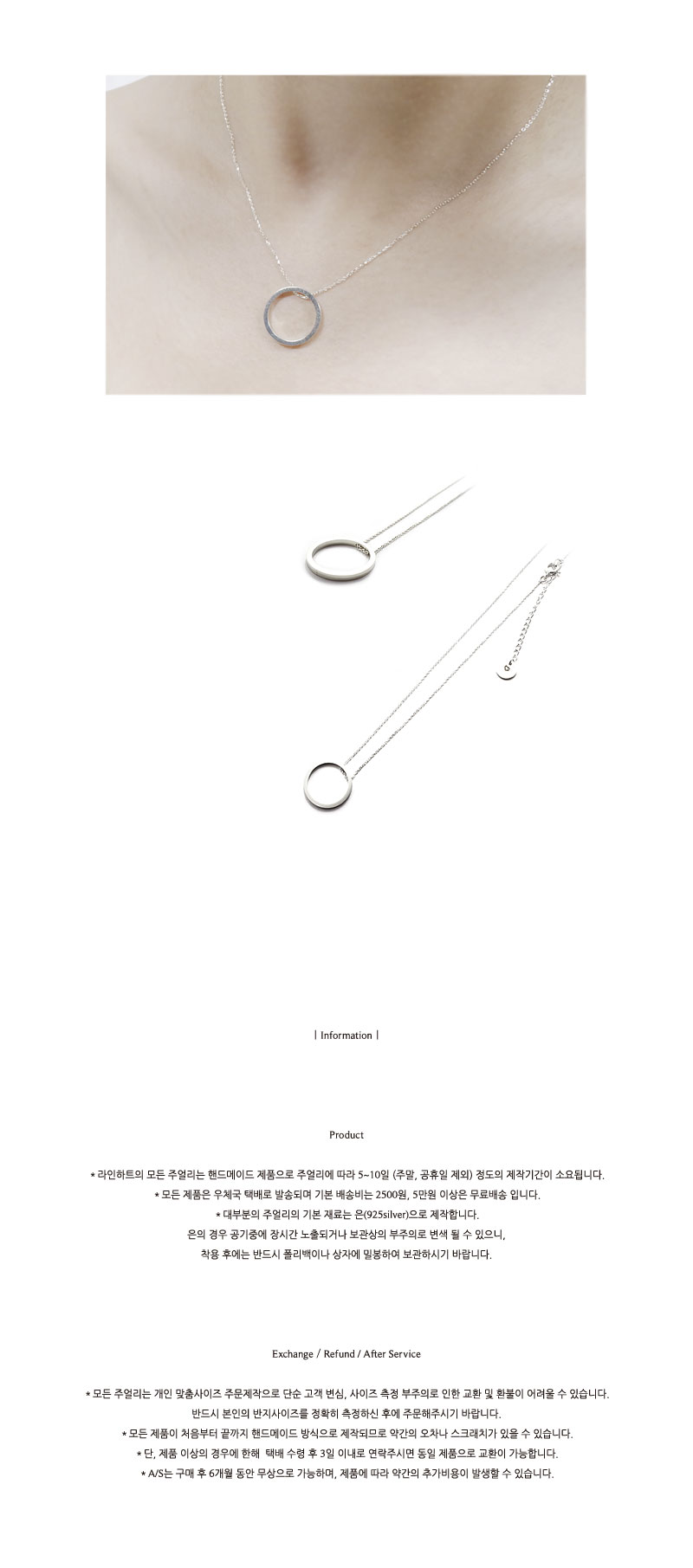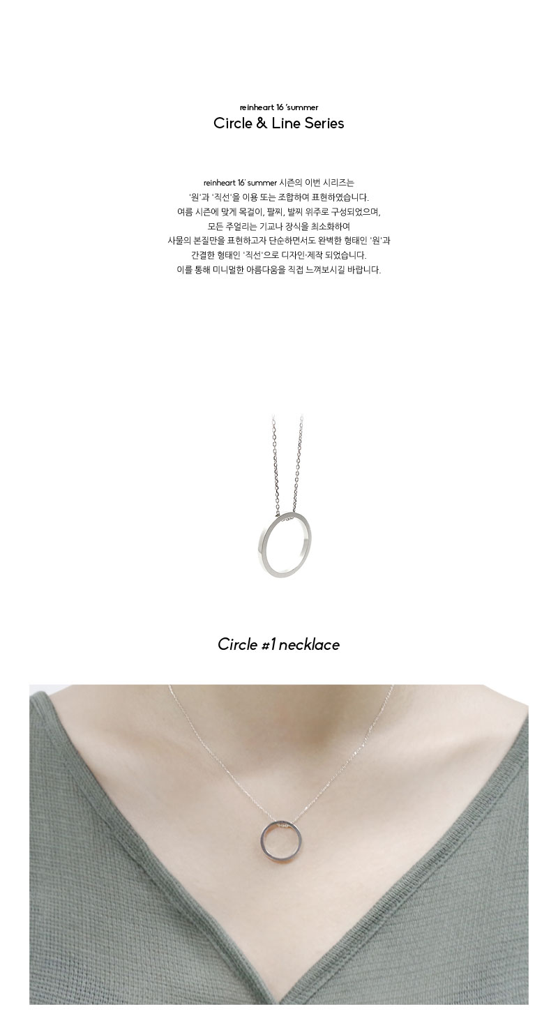 선으로 이루어진 원 목걸이 입니다. 군더더기 없는 깨끗한 원이 느껴지도록 오링을 붙이지 않고서 링 자체에 구멍을 내어 체인을 연결하였습니다. 심플하고 간단한 디자인이지만 라인하트 만의 디테일을 느끼실 수 있는 제품입니다. 착용시 페미닌한 무드로 연출됩니다. 체인 길이는 기본 목걸이 기장(40cm)이며, 추가로 여분체인 5cm를 달아 자유롭게 길이를 변경하실 수 있도록 제작하였습니다. 여분체인 끝엔 라인하트 로고가 새겨져 있습니다.