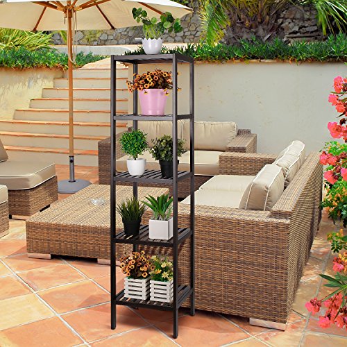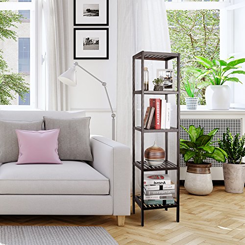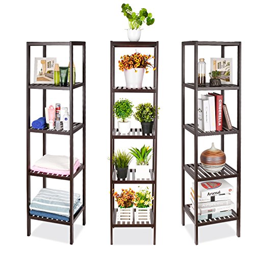 - 3. Multi-Use: The 5 tiers bamboo shelf is suitable to be placed in the hall, living room, bed room, balcony,etc. Also with the 5 tiers bamboo rack and storage shelf will convenient for placing toiletries, towels, sundries, shoes, books, plants, spice and small appliances in many places.