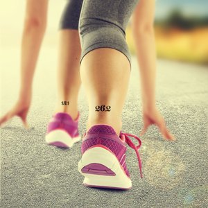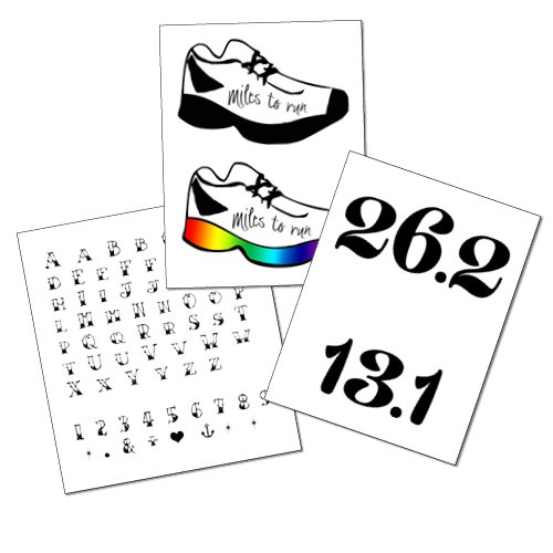 Running tattoo set includes 2 each of the following 3 designs: Alphabet & numbers, Miles to run, 26.2 / 13.1