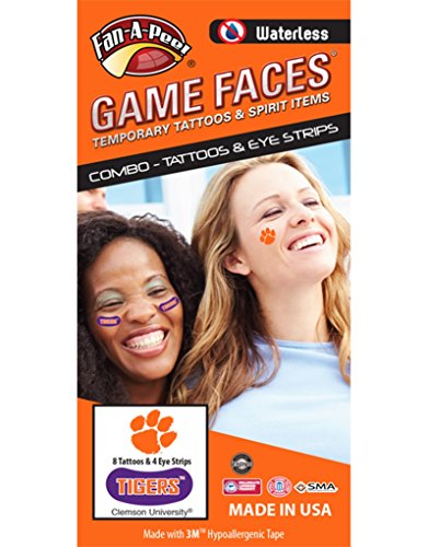 Clemson University Tigers – Waterless Peel & Stick Temporary Tattoos – 12-Piece Combo – 8 Orange Tiger Paw Logo Spirit Tattoos & 4 Orange/White Tigers on Purple Eye Strips
