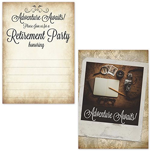 Retirement Party Invitations - Adventure Awaits Fill in the Blank Invites - (20 Count with Envelopes)