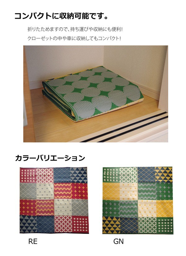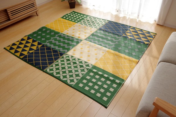 カラフルなパッチワーク調にデザインした、ポリプロピレン素材を細いパイプ状にして織り込んだラグです。アトピー協会推奨品としても認定されており、また強度が高くしっかりとしています。汚れても水洗いができるので、いつでも清潔にお使い頂けます。お子様の部屋に、アウトドアに、ペットのいるご家庭に最適な万能カーペットです。小さく折りたたむことが可能なコンパクトタイプです。収納時にも場所を取りませんので、アウトドア等に便利な商品です。
