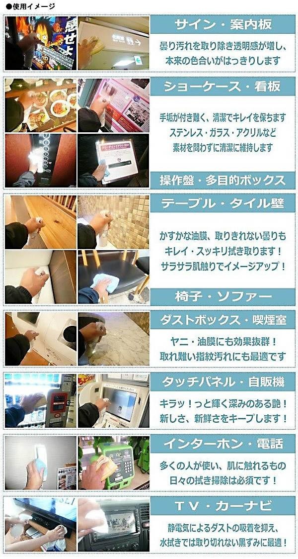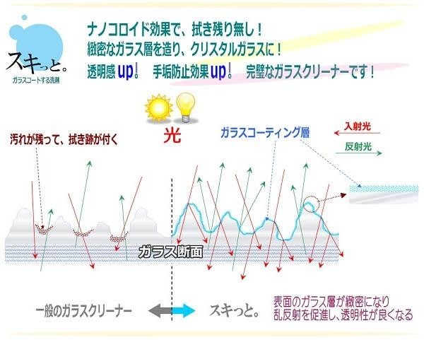 | 成分 | 天然ヤシ油系界面活性剤(コロイド成分)、天然無機ガラス成分、特殊電荷水、艶出し剤、アルキル珪酸エチレート、添加剤 |