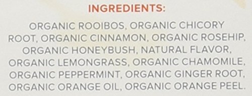-. Feature : Naturally caffeine free Rooibos red tea infusion / Bursts of sweet orange tangle with spicy cinnamon / Spiced with chicory root, rosehip, cinnamon, lemongrass, peppermint, chamomile, ginger root, anise seed, and orange peel / No artificial flavors, colors or preservatives / Kosher certified and gluten free