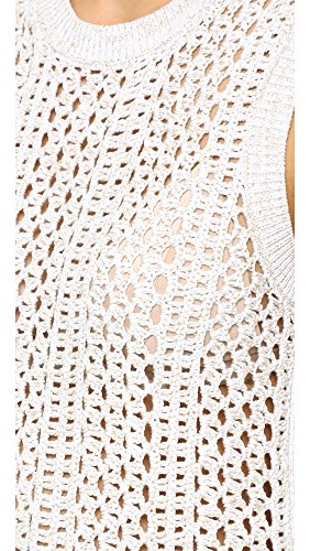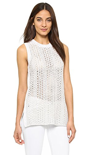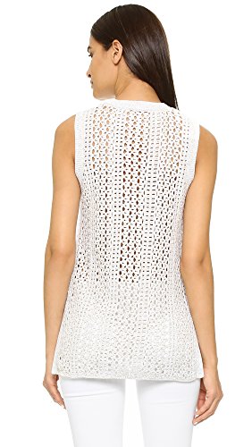 An open-knit Theory sweater, detailed with bands of fine trim. Long side vents relax the hem. Sleeveless. Semi-sheer.