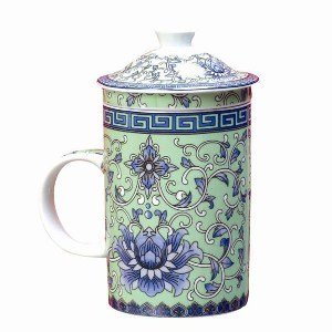 -. Brand : Terrific Finds -. Color : Blue -. Feature : Gorgeous Green and Blue Floral Design with Calligraphy / Made from High Quality Glazed Ceramic / Perfect for Loose Tea or Tea Bags / Removable Diffuser and Lid / 5.00" x 4.50" x 3.00" -. Label : Asia Overstock -. Manufacturer : Asia Overstock -. MPN : 10031 -. PartNumber : 10031 -. ProductGroup : Kitchen -. ProductTypeName : KITCHEN -. Publisher : Asia Overstock -. SKU : TF0036 -. Studio : Asia Overstock -. Title : Beautiful Green and Blue Floral Porcelain Tea Cup with Strainer and Lid