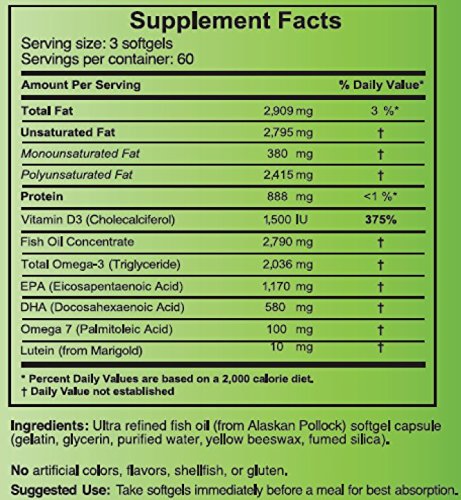 2 Month Supply. Sourced and made in the USA; our fish oil is from Alaskan wild caught Pollock, designated a Certified Sustainable Seafood by the Marine Stewardship Council that is then re-esterified as a triglyceride molecule and independently tested and certified by NSF International ensuring ingredient integrity and purity. Our unique dry eye formulas also support overall vision health by delivering the purest Omega-3s and Omega-7 along with Lutein and Vitamin D3. Not only are we delivering the highest purity fish oil - we are also supporting U.S. jobs! Omega-7 is a signaling molecule that enhances mucous membranes and helps fight inflammation. No Fish Burps Guaranteed - due to our triglyceride molecular form and low level of oxidation. Preserved with natural Vitamin E to prevent oxidation. Triglyceride based, giving you 70% better absorption than standard "supermarket" fish oil supplements. Ensuring that more of the essential fatty acids EPA/DHA are absorbed into your blood stream.Feature