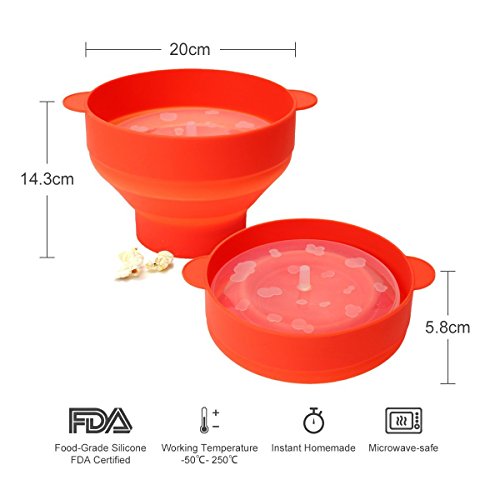 - ★CONVENIENT HANDLE & ANTI-SPLASH LID: With the heat resistant HANDLES on two sides of the bowl, you don't need to use hot pads to remove it from the microwave. With the transparent silicone ANTI-SPLASH LID, there's no need to worry that popcorn jumps out of the bowl in the production process.