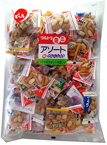 原材料:【柿ピカ】ピーナッツ、澱粉、米、しょう油、植物油脂、砂糖、デキストリン、食塩、かつおエキス、香辛料/加工でん粉、調味料(アミノ酸等)、着色料(カラメル、カロチノイド、紅麹)、香辛料抽出物、(一部に小麦・落花生・大豆を含む) 【スパイス】ピーナッツ、小麦粉、砂糖、澱粉、しょう油、寒梅粉、デキストリン、のり、食塩、ブドウ糖、香辛料、はちみつ、酵母エキス/加工でん粉、膨張剤、調味料(アミノ酸等)、糊料(プルラン)、香料、(一部に小麦・落花生・大豆を含む) 【ピー海苔】ピーナッツ、もち米、しょう油、植物油脂、のり、砂糖、食塩、澱粉、デキストリン、香辛料、風味調味料、蛋白加水分解物/調味料(アミノ酸等)、着色料(カラメル、カロチノイド)、香辛料抽出物、(一部に小麦・落花生・大豆を含む) 【つぶ餅ピー小魚入り】ピーナッツ、澱粉、米、片口いわし、しょう油、砂糖、植物油脂、デキストリン、食塩、みりん、ごま、香辛料、発酵調味料/加工でん粉、トレハロース、着色料(カラメル、紅麹、カロチノイド)、調味料(アミノ酸等)、香辛料抽出物、(一部に小麦・落花生・大豆・ごまを含む) 【いかピー】ピーナッツ、小麦粉、砂糖、寒梅粉、澱粉、植物油脂、いか、食塩/膨張剤、調味料(アミノ酸等)、(一部に小麦・落花生・いか・大豆を含む) 【梅】梅、酢、食塩、異性化糖、還元水飴、発酵調味料/調味料(アミノ酸等)、酒精、酸味料、香料、着色料(赤102)、ビタミンB1、(一部に大豆を含む) 【プルーン】プルーン、植物油脂、/酒精、保存料(ソルビン酸K)