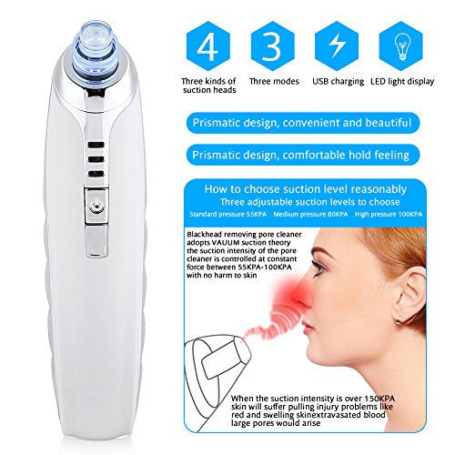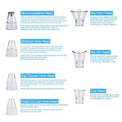 Instruction Of Different Heads: Microcrystalline Head: With more than 100 thousands natural mineral microcrystalline particles and high absorption, it can scrub and exfoliate the dead skin, and suck it out Using area: Any area on face except the area around the eyes, and the area has wrinkles and rough is suitable to use, such as: elbow, knee and ankle. Big Circular Hole Head: With strong suction, it can remove blackhead effectively, letting the skin rejuvenate again. Can be applied to blackheads and V face. Using area: Any area on face except around the eyes. Small Circular Hole Head: Suction is weak, which can be used to remove blackhead at the sensitive area.