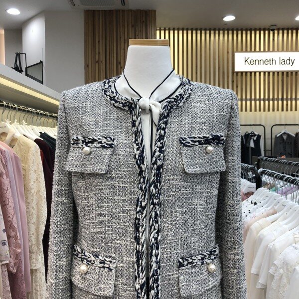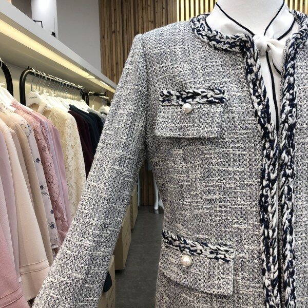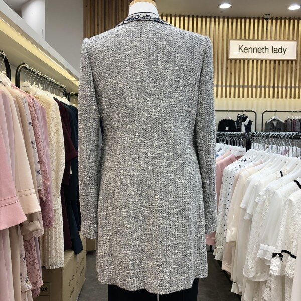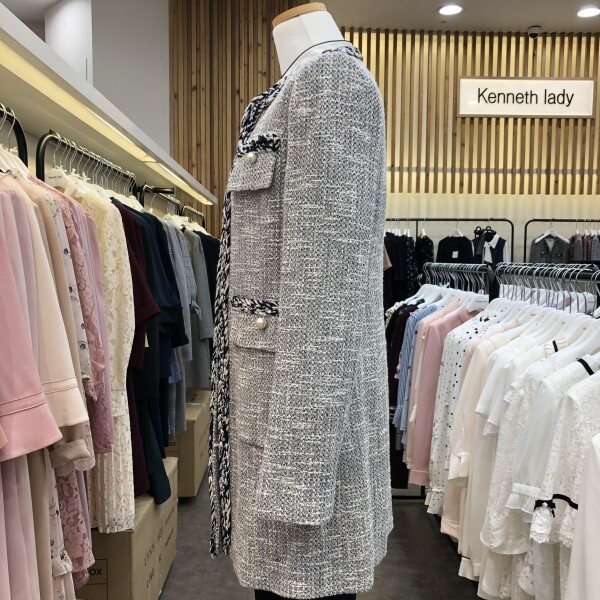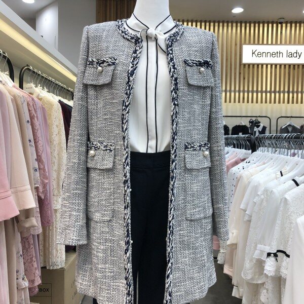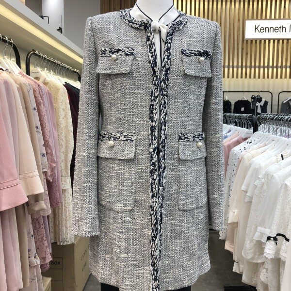 라운드네크라인의허리라인이살짝들어가고 전체트위드소재에 느낌의 롱자켓입니다.양쪽주머니에 전주단추가포인트라 더욱돋보이는 고급스러운느낌의 트위드롱자켓입니다.