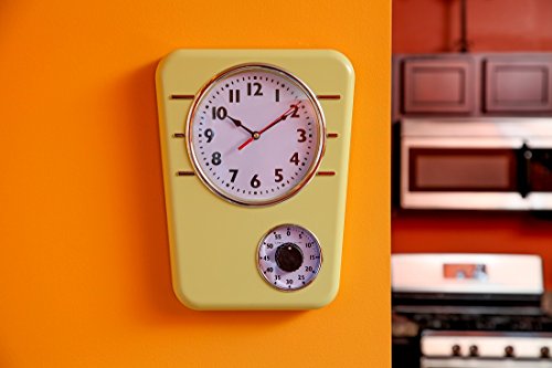 -. Binding : Kitchen -. Brand : Lily's Home -. Feature : Built-in one-hour timer for cooking / White dial with black hands / Large size, measure appox 9.5 inch wide and 13.3 inch long / Require 1 "AA" battery (not included) / Made of durable plastic -. Label : Lily's Home -. Manufacturer : Lily's Home -. Model : SW306 -. PackageQuantity : 1 -. ProductGroup : Home -. ProductTypeName : HOME -. Publisher : Lily's Home -. Studio : Lily's Home -. Title : Retro Kitchen Clock With Timer. By Lily's Home