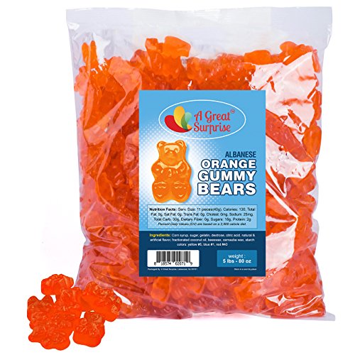 -. Feature : Albanese Gummy Bears offers the taste bud tingling snacking experience that only a high quality candy can offer. Each piece features a classic teddy bear shape, with round ears and adorable little paws. You know you're getting the real deal when you see the company's A on each gummy bear's belly. / This single-flavor package features the exotic flavor of fresh Orange with a soft and chewy texture. Complement a tropical party theme or enjoy a sweet summery snack with these cute little chewy gummy bears! Beautiful bright orange is a pleasing color to put on display in an elegant candy bowl. / We make it easy to get the amount you need for gatherings or everyday snacking with our money-saving bulk gummy bear pack. / These cute little teddies will put a smile on everyone's face and are perfect for baby showers, children's birthday parties and to fill up any candy buffet. Try them out! / Buy in bulk to save money. Includes 5 lbs. Approximately 130 pieces per pound. Great candy that will be loved by kids of all ages (and adults too). Enjoy these sweet treats with many enticing flavors of the classic candy you crave. Items are repackaged in a facility that may contain milk, soy, peanuts, tree nuts, eggs, wheat and all other allergens.
