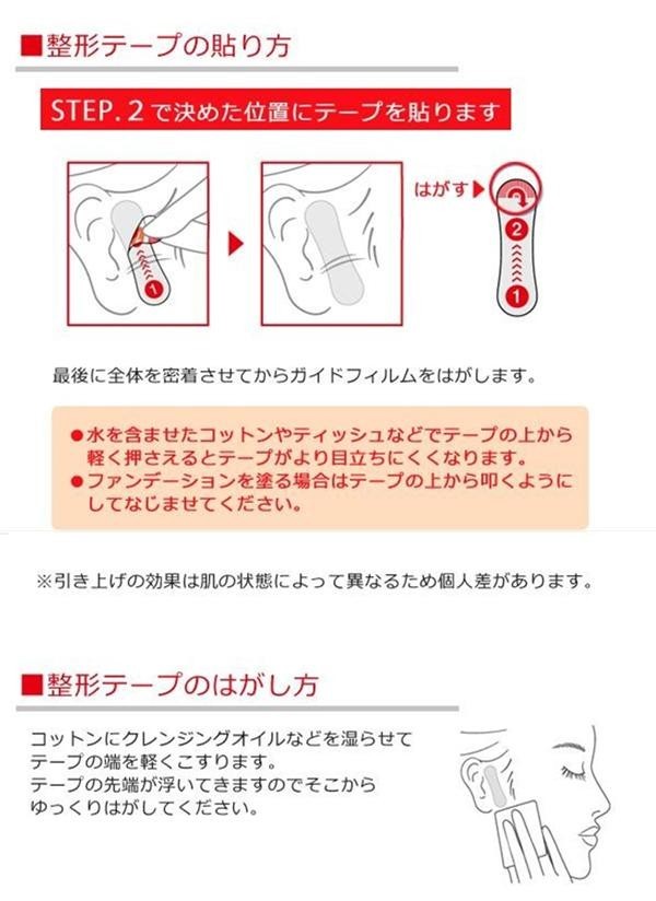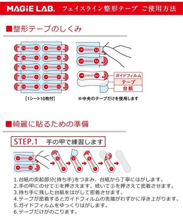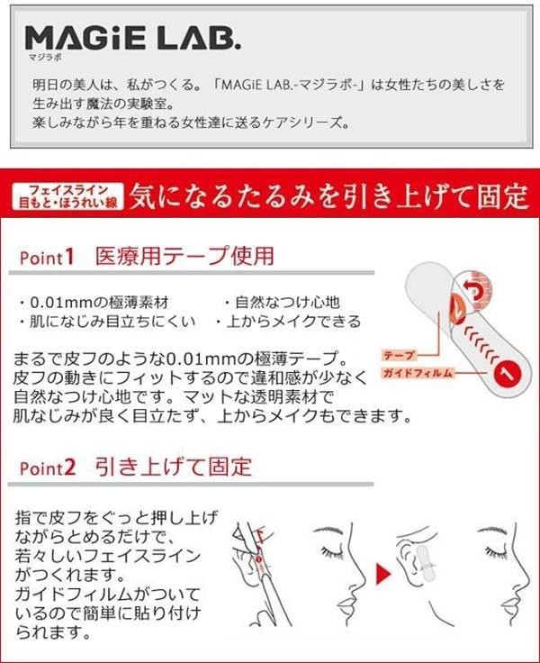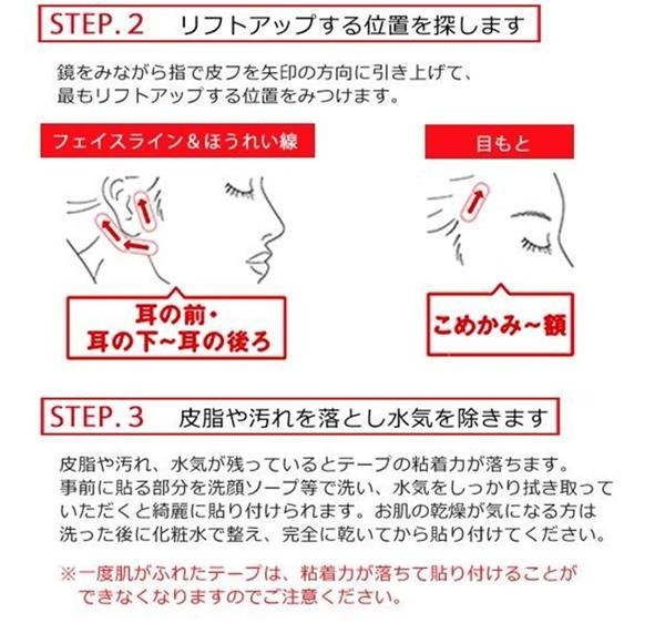 まるで皮フのような0.01mmの医療用極薄テープを使用。皮ふの動きにフィットするので違和感が少なく自然なつけ心地です。マットな透明素材で肌なじみが良く目立たず、上からメイクもできます。指で皮フをぐっと押し上げながらとめるだけで、一日中たるみ知らずの若々しいフェイスラインに。ガイドフィルムがついているので簡単に貼付けられます。初めての方におすすめのトライアル版です。日本製。 |