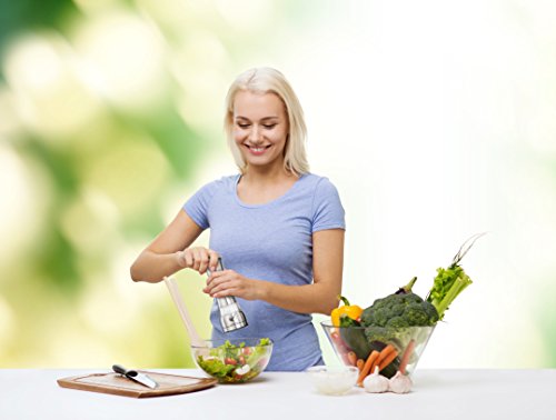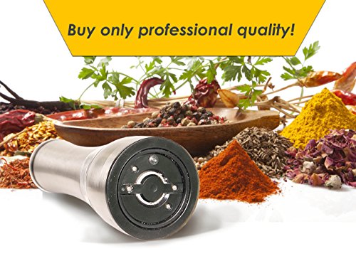 - EASY TO USE: we have considered that when you hold the grinder in your hand you should be comfortable to press the button, thanks to which you will drop the crushed precred. It is also convenient to fill pepper corn, which is 150 grams, which is enough for a long time in the use. In the lower part is the regulator of the possibility of setting the roughness of grinding and the expenditure of spices will give your food a fresh taste.Easily adjust the grinding setting by simply twisting the knob on the ends of the mill. Additional features include a base for precise seasoning, an acrylic viewing chamber to easily identify the contents as well as a sleek stainless housing which compliments any kitchen decor.