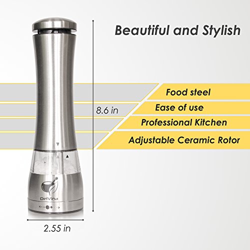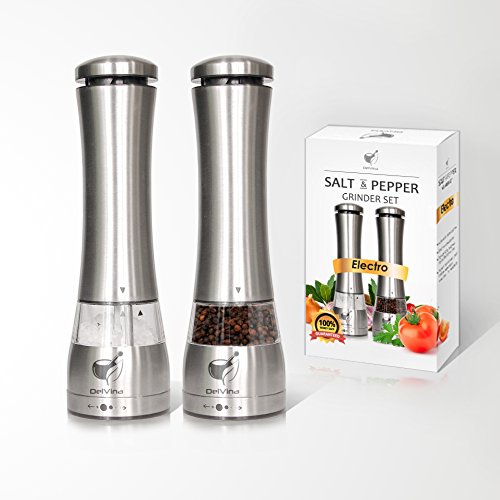 - BEST SALT AND PEPPER ELECTRIC GRINDER: when we are sitting at the dinner table, going on a picnic or professionally prepare food in the kitchen or in a restaurant, we always want our food to have pleasant aromas of spices or it was deliciously salted. For this purpose we created a unique DelVina brand! These pepper mills are improved by electric motor and can grind for you: Himalayan salt, pepper corns, sweet pepper, red pepper and other fragrant and delicious seasonings.