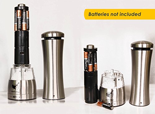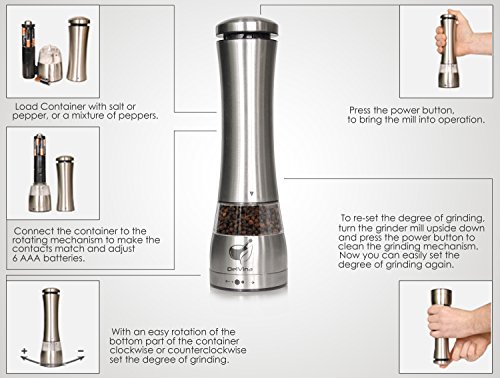 - GET IT TRUST: DelVina tries to monitor the quality of the produced salt and pepper mills sets, and we in turn guarantee a refund within 30 days. Instructions for use are on the box. On this you do not worry, buy and use the trust electric salt and pepper grinder set DelVina.The powerful, battery powered engine of these mills allow you to grind sea salt, black peppercorn, coriander, cumin seeds, paprika and more with unparalleled ease and safety.