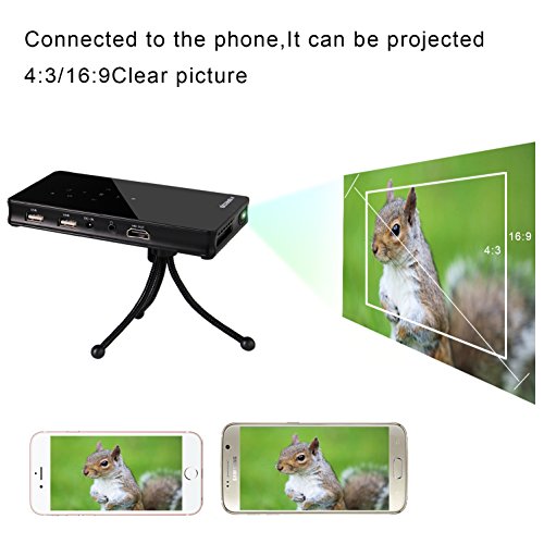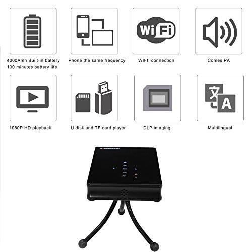 -. Feature : Portable Design: 5.7x3.1x0.7 inches,weighing in at 205grams,the mini projector is a portable powerhouse that fits easily into anyone's pocket or handbag.Built-In 4,000 mAh rechargeable Li Ion Battery provides up to 120 Minutes of play time. / Multi-function interface: USB, USB OTG, Mini HDMi, SD Card input, with integrated speakers and headphone jack, the pocket projector can be connected to any modern device. / supports 1080p, native resolution of 720p and can decode h264 files, allows for great cinema quality on the go and an amazing visual experience. / Portable Intelligence: Android OS, 1Gb Ram, 16G ROM, 8-core CPU and 4-core GPU. 6,000mAh battery (1.5hours of HD movie time), all of these combine to make a powerful and smart portable projector. It's mute button, graphite cooling system for great heat dissipation, and its touchpad ensures an enjoyable user experience. / Watch all your favorite movies or make an impressive business presentation anywhere with its portable, lightweight design & long lasting 2 hour rechargeable battery