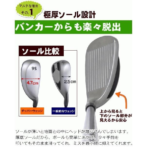 | 通常比約2倍の厚いソールが、芝すべり・ダフリを激減。ボールの前にクラブをポンと置くだけで、しっかり構えることが可能な安定ソール。重心位置が非常に低く、ボールを上げやすい構造。横に広いスイートエリアは、大幅にミスヒットを軽減します。通常チッパーはグリーン回りの専用のクラブですが、チッパーウェッジは『フルショット』も可能です! |