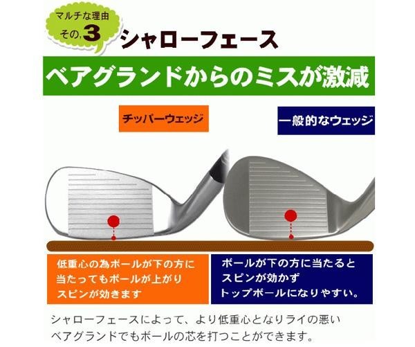 通常比約2倍の厚いソールが、芝すべり・ダフリを激減。ボールの前にクラブをポンと置くだけで、しっかり構えることが可能な安定ソール。重心位置が非常に低く、ボールを上げやすい構造。横に広いスイートエリアは、大幅にミスヒットを軽減します。通常チッパーはグリーン回りの専用のクラブですが、チッパーウェッジは『フルショット』も可能です! |