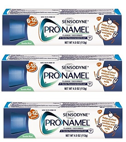 -. Binding : Health and Beauty -. Brand : Sensodyne -. EAN : 0088234836947 -. Feature : From the makers of the #1 dentist recommended brand for strengthening and protecting enamel, ProNamel® 6-12 Years Toothpaste for Kids is specially designed with an optimized fluoride formulation to protect your child's teeth. ProNamel® Kids helps to protect your enamel from cavities and the effects of acids found in everyday foods and drinks, which can lead to acid erosion. Your child's first adult tooth tends to erupt at around 6 years old. -. IsAdultProduct : 0 -. Label : Sensodyne -. Manufacturer : Sensodyne -. MPN : Kids -. PackageQuantity : 3 -. PartNumber : Kids -. ProductGroup : Health and Beauty -. ProductTypeName : HEALTH_PERSONAL_CARE -. Publisher : Sensodyne -. Studio : Sensodyne -. Title : Sensodyne ProNamel 6-12 Years Toothpaste for Kids 4 Oz (Pack of 3) -. UPC : 088234836947