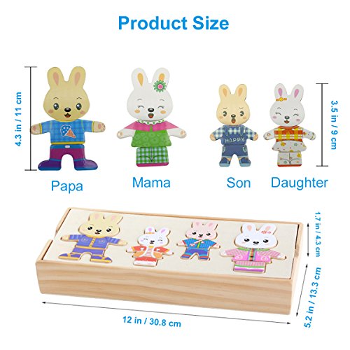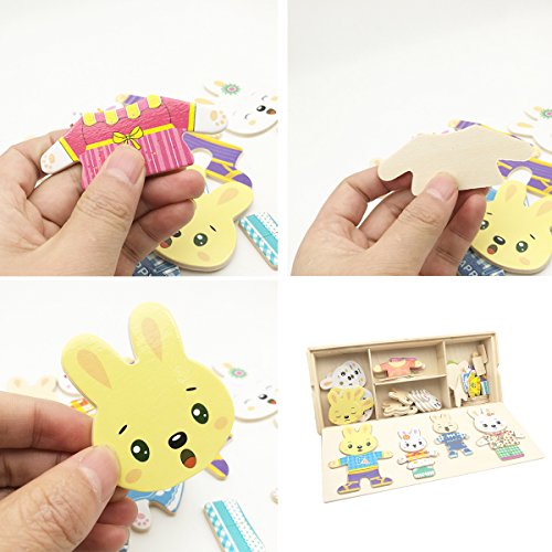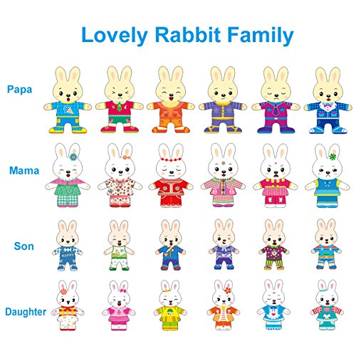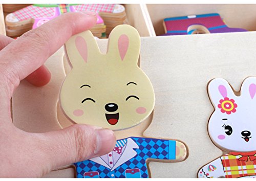 Studio : MICKYU Publisher : MICKYU Product Description This adorable Mama, Papa, and Baby Rabbit family love to play dress-up and find just the right outfits to match their moods. The 72 beautifully crafted painted wooden pieces fit into the three insets in the four decorated wooden puzzle board that also serves as a lid to the sturdy wooden storage case with three separate compartments. Pieces include different expressions for the four rabbit to convey mood and inspire storytelling, and tops and bottoms to mix and match.