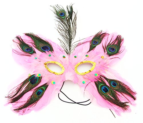 -. Brand : Mardi Gras World -. Color : Pink -. Department : womens -. Feature : Dramatic contrast of color and feathers- / Attached by comfortable twin bands of elastic- / Mask adorned with braids and chandelle feathers with a peacock feather topper! -. ProductGroup : Apparel -. ProductTypeName : ADULT_COSTUME -. Size : One Size Fits Most -. Title : Light Pink Peacock Venetian Butterfly Feather Mask Mardi Gras Masquerade Halloween