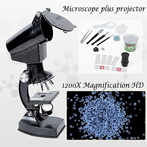 -. Feature : Educational Microscope: Educational microscope kit encourages scientific exploration and discovery, introduces a key scientific tool in a fun way! Super educational toy includes everything necessary for a child to be introduced to science and get started dissecting specimens. / Top Material: A premium quality microscope for children made from ABS acrylic that makes it durable. / Clear Magnification: This kids microscope features 3 levels of magnification (300X, 600X and 1200X) that are ideal for child use. Provides clear magnification quality for most child use. / 4 Way System: Includes conventional observation mode, screen display mode, projector observation mode and projector drawing mode. Built in LED light that provides direct control of light. Power by 2 AAA batteries (not included) / Package Contents: 1 x observation collecting cup, 1x transparent hand-held magnifying glass, 1 x slideshow, 6 x cover glass, 5 x standard paper,1 x tweezer, 1 x scalpel, 1 x smear knife, 1 x needle, 4 x slides, 2 x specimens.