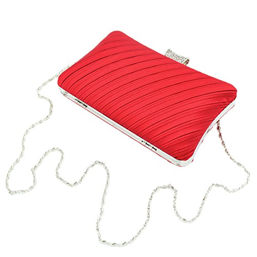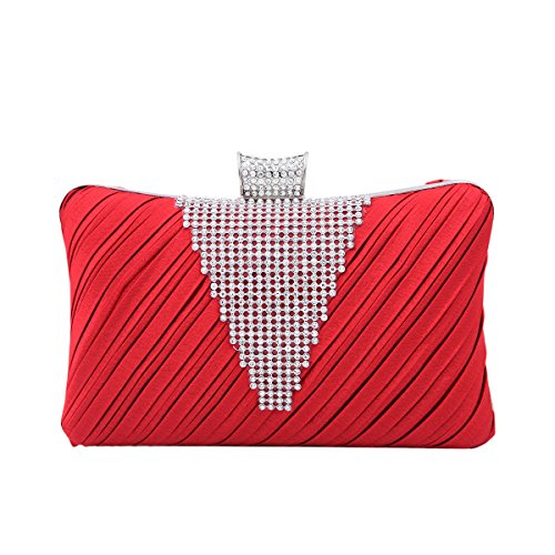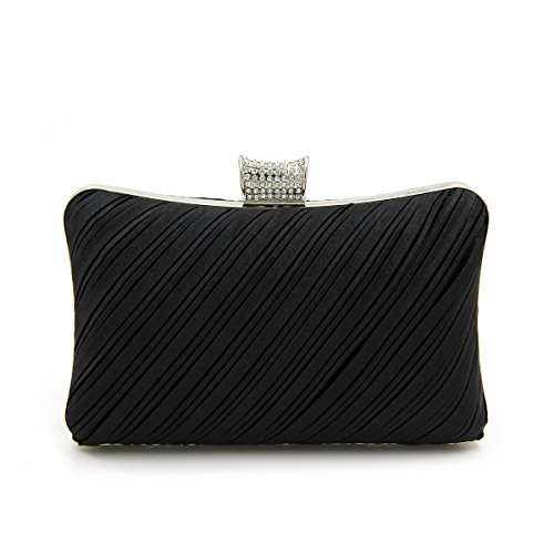 This premium quality evening clutch is both elegant and stylish. Pleated satin fabric with sparkling rhinestones crystal clasp top closure. Detailed fully lined hard clutch and divided interior compartment with interior zip divider compartment to keep your belongs safe and secure. Come with 2 sizes of removable hideaway chain straps: 8" drop and 23" drop. Stunning, functional and versatile. The size is 8" (L) x 5" (H) x 2.5" (W). Elegant design and luxury feel. A must have accessory for the perfect night out. TrendsBlue® is a registered trademark.