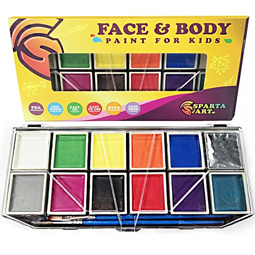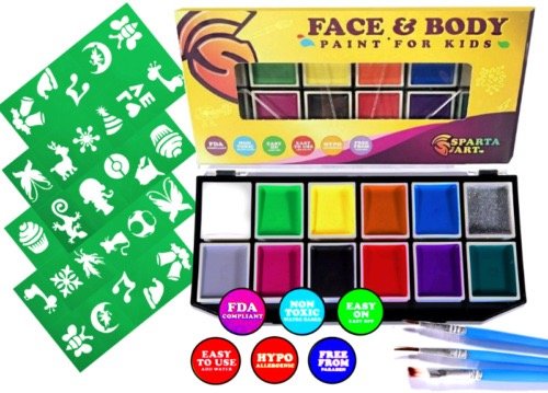 12 COLOR PACK: Sparta Art kid's face and body paint include 12 ultra bright and easily mixable paints colors. This set includes all your necessary and useful accessories for the ultimate experience: 2 reusable painting brushes for the applying paint and set of stencils for creating good looking and accurate designs.