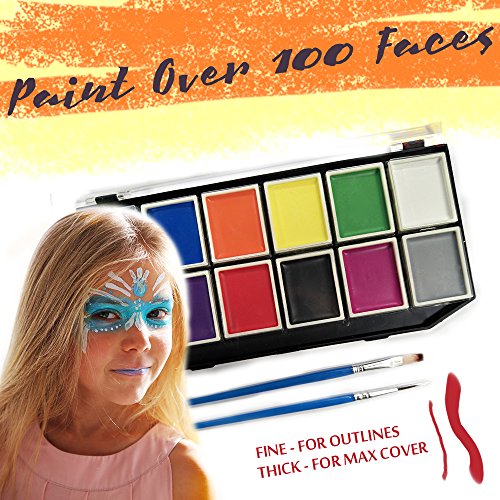 COMPLETE SET Along with the 12 paints, we include 2 very durable and reusable brushes for applying paint. All these elements come in the high-quality plastic box for storage. Our set is long lasting. One 10 ml pot allows you cover up to 100 kid's faces. If you want to make colors more bright or saturated just apply thicker level of the paint.