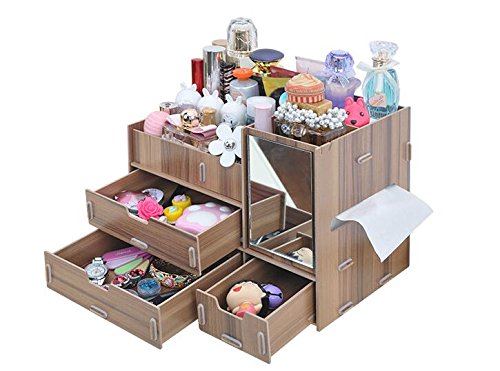 B&S FEEL Fashion DIY Wooden Makeup Storage Display Box 3 Drawers Jewelry Cosmetics Storage Organizer with Mirror