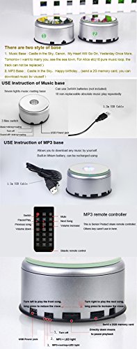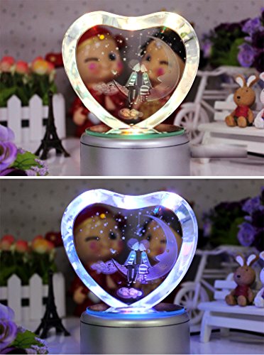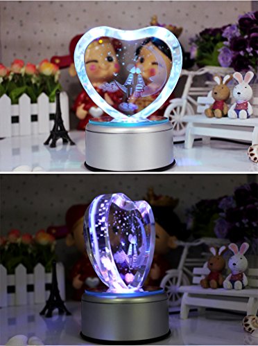 Feature : MP3 music base default tracks: Crystal, love it. (download music to the given 2G memory card yourself.) And we also can be free for you to download one or two songs you want. / Engraved with a couple are kissing on the moon in a 3D Heart shaped crystal. / K9 Crystal: Pure and luxury. Advanced laser inside carving tech insures the amazing 3D effects / Automatically rotating music box base with LED colorful lights: Gradient red, yellow, blue and green lights shine in the precious crystal Carousel when the music is flowing in the air. / The best gift for her, let Crystal Rose witness your true love.