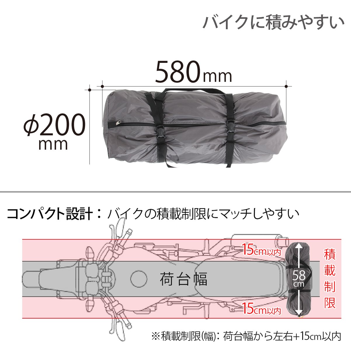 ● 58 cm compact design assuming loading on a motorcycle.