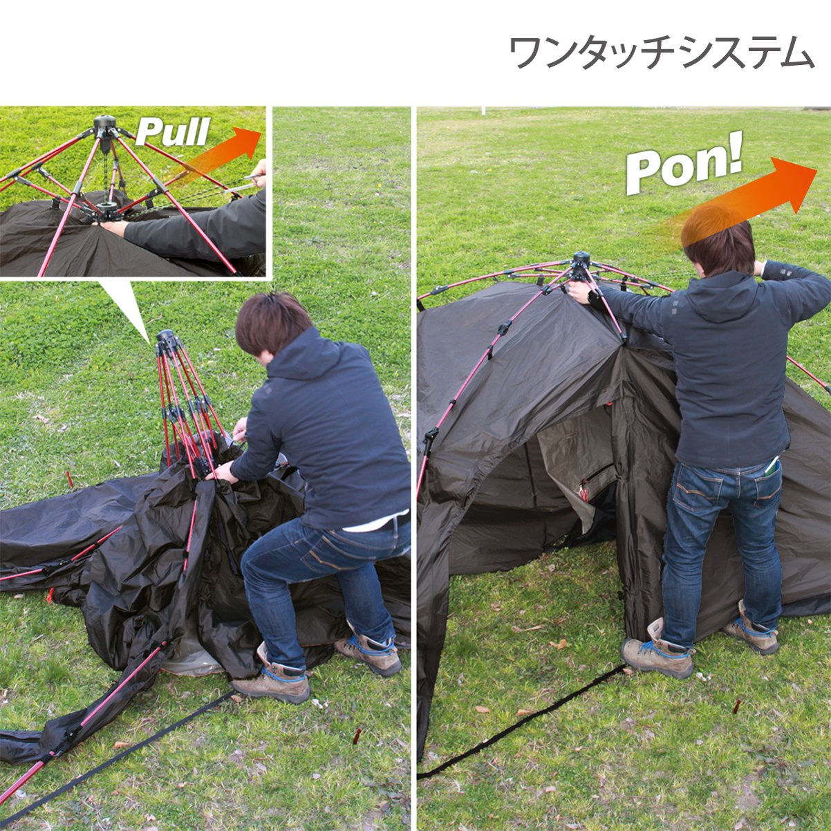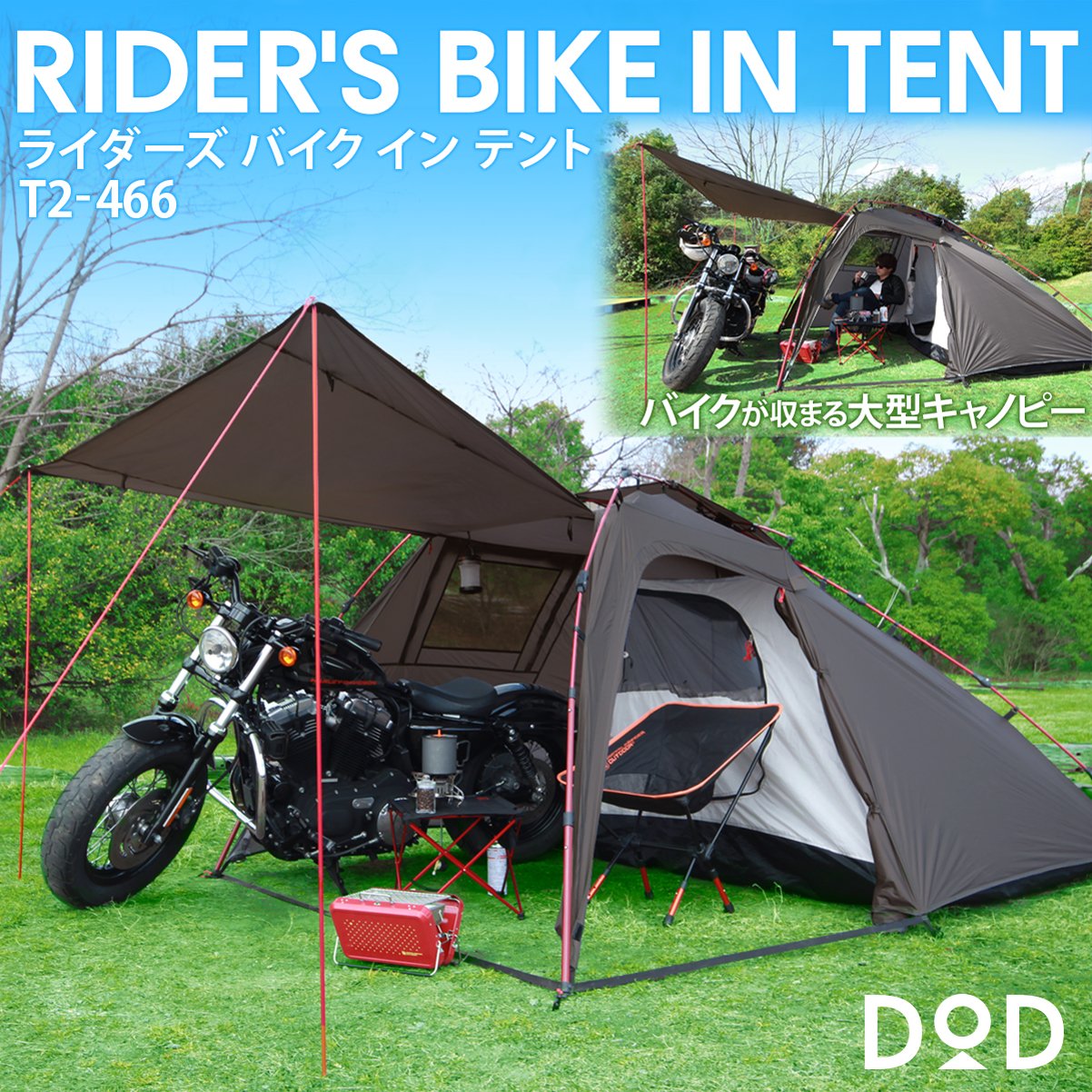It is a two room tent for touring which completes bedroom, motorcycle storage space, living space with one touch.