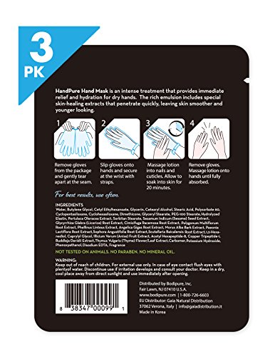 bodipure HandPure Hand Mask provides immediate relief and hydration for dry hands. Leaves skin smoother and younger looking. Not tested on animals. No paraben or mineral oil. One size fits all.