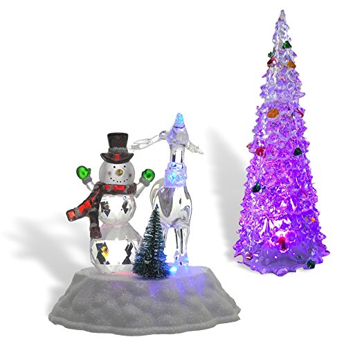 - ACRYLIC CHRISTMAS DECORATION. Cute set of happy snowman and reindeer statue paired with a LED light up Christmas tree. This is a great set to add to your mantel, Xmas centerpiece or add to your holiday train or Christmas village set up.