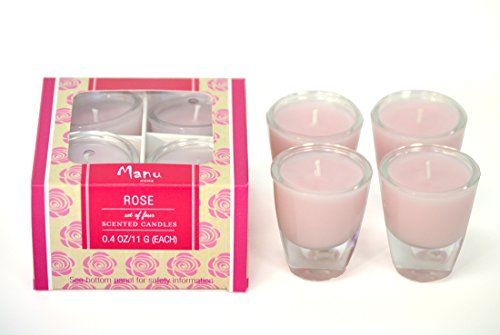 Studio : Manu Home Publisher : Manu Home Binding : Kitchen Product Description The Manu Home Rose 4 pack --The signature fragrance is strong and energizing an interpretation of the unwavering will of the independent spirit. These candles are a gift that's sure to make anyone smile. Makes a terrific Birthday Gift, House Warming Gift or a just because gift. Manu Home is committed to making beautiful, hand-crafted candles for the modern home -- with a focus on simplicity, charm and sophistication. We pay special attention to the details, knowing that our candles must effortlessly compliment the beautiful spaces in which they exist. Manu Home® aromatherapy candles add the perfect touch of warmth to any setting. Each candle has long lasting enjoyment. Each candle will fully burn and will abundantly emit fragrance for many, many hours. Manu Home candles are made with care in the U.S.A. by folks like you, who really like their home to smell nice and who care about the environment. Please try our product and leave your feedback. It's All in the Details ? Manu Home® 0