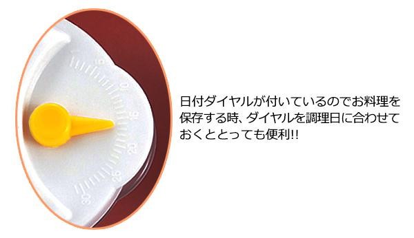 フタをしたまま電子レンジに使用できる容器です。角型と小判型には日付ダイヤルが付いているのでお料理を保存する時、ダイヤルを調理日に合わせておくととっても便利!! |