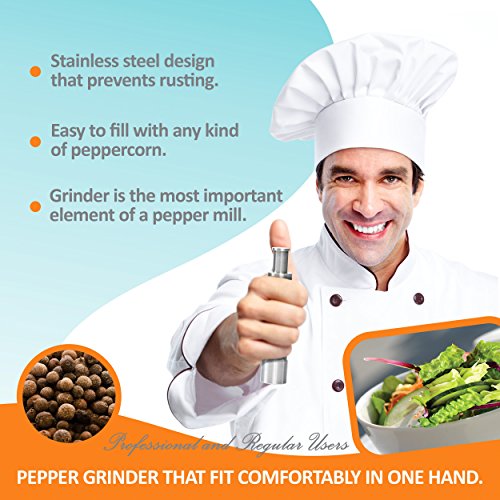 SOLID HIGH QUALITY PEPPER GRINDER STAINLESS STEEL DESIGN prevents rusting and also GUARANTEES that you get just the perfect sprinkle added to your food when grinding flavor enhancing pepper to your home cooked meals.