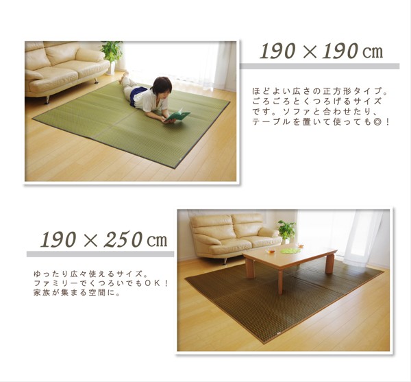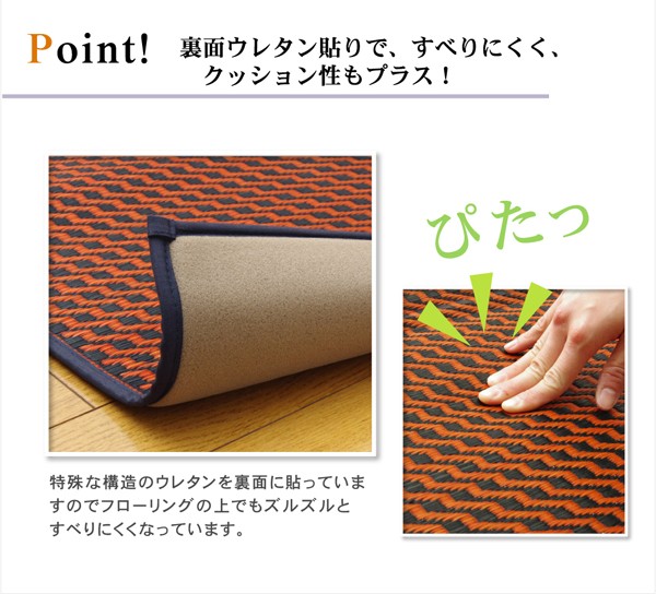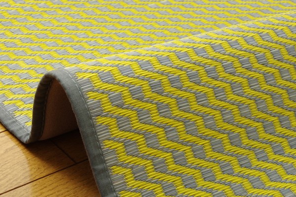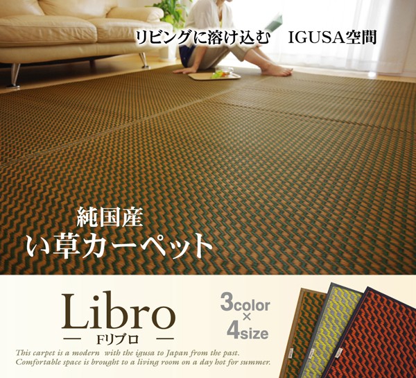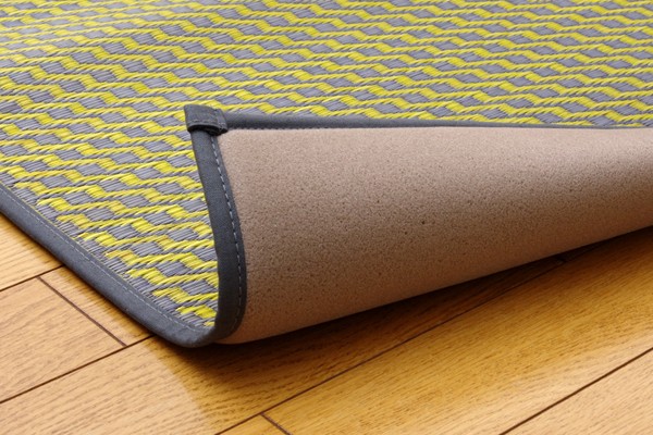 イタリア語で本という意味のリブロ、様々な人が集う図書館で、集いリラックスする空間を作りたいという思いから作っています。色のバイカラーで、新鮮かつ意外性のある、印象的なラグです。国産(九州産)のい草を使用しています。一本一本が太く、表皮が厚く繊維がキメ細かいので弾力性があり、耐久性に優れています。い草には空気の自然浄化作用、湿度の調節作用などがあります。また汚れにくく、裏にはウレタンを貼っていますので適度なクッション性があり、フローリングでのご使用にも適しています。い草に青森ヒバ加工を施しています。(抗菌、防臭効果)