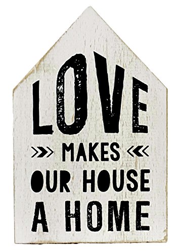 - Block sign says: "Love Makes Our House a Home" in black letters