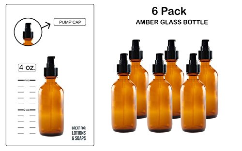 Hand-Squeeze Pump /Glass Medicine Bottle, Amber Boston Brown Round Bottles 4OZ. 6Pack - For Essential Oils, Scents, Travel, Perfume Kitchen, Bath, Cooking, Labs, Laundry, Cosmetic- Reusable -By Katzco