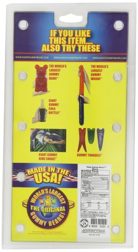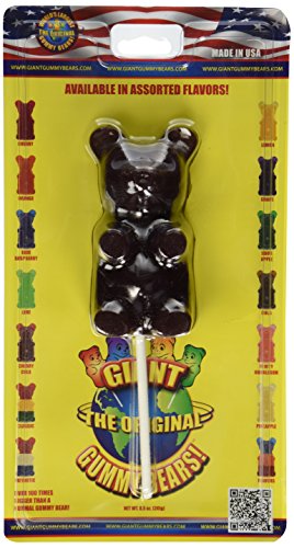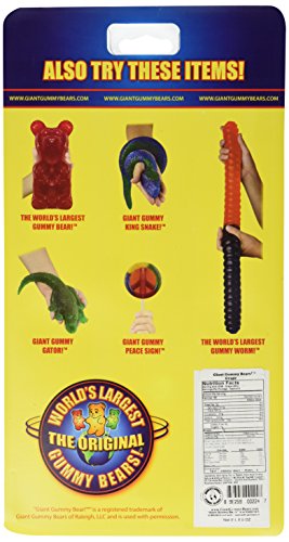 -. Binding : Grocery -. Brand : World's Largest Gummy Bears -. Feature : Each Giant Gummy Bear is 1/2 pound in weight and equivalent to 88 regular sized gummy bears / Each Giant Gummy Bear is mounted on an extra-strong stick for long lasting gummy enjoyment / Giant Gummy Bears made in the USA from only with the best ingredients / Giant Gummy Bears are gluten-free / 12+ Months shelf life -. Label : World's Largest Gummy Bears -. Manufacturer : World's Largest Gummy Bears -. PackageQuantity : 1 -. ProductGroup : Grocery -. ProductTypeName : GROCERY -. Publisher : World's Largest Gummy Bears -. Studio : World's Largest Gummy Bears -. Title : Giant Gummy Bear On A Stick