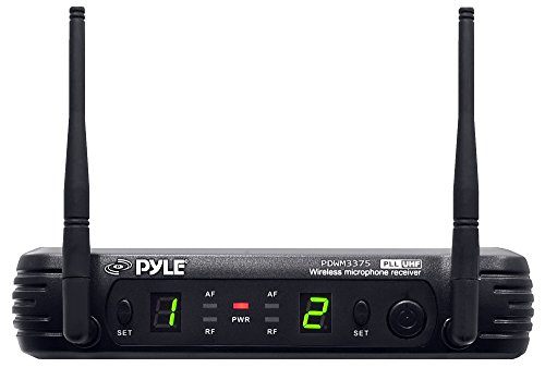 -. Binding : Electronics -. Brand : Pyle -. Color : Black -. Department : Electronics -. EAN : 5554442472291 -. Feature : Led power indicator & channel display - uhf signal for wider range and less obstruction - power supply: 110/220vreceiver specifications - border upon channel rejection: > 70 dB - includes (2) wireless dynamic microphones / Operation Range: Up to 164 ft. - Up to eight separate channels to choose from - RF Frequency Range: 673-697.975 MHz - T.H.D.: < 1% - RF Frequency Range: 673-697.975 MHz - Spurious Emission: > 55 dBc / Audio Level Indicator for wireless system audio signal level - 1/4" audio output jack - Image & Spurious Rejection: >70 dB - Audio Output Level: 0-300 mV - RF Output: >10 dBm - Nominal Current Drain: < 40mA / Please refer the Instructional Video and also the User Manual attached below for instructions and troubleshooting steps. -. IsAdultProduct : 0 -. IsAutographed : 0 -. IsMemorabilia : 0 -. Label : DJ Tech Pro USA, LLC -. Manufacturer : DJ Tech Pro USA, LLC -. ManufacturerPartsWarrantyDescription : Parts -. Model : PDWM3375 -. MPN : PDWM3375 -. NumberOfItems : 1 -. PackageQuantity : 1 -. PartNumber : PDWM3375 -. ProductGroup : Musical Instruments -. ProductTypeName : SOUND_AND_RECORDING_EQUIPMENT -. PublicationDate : 2015-06-17 -. Publisher : DJ Tech Pro USA, LLC -. Size : uhf -. Studio : DJ Tech Pro USA, LLC -. Title : PylePro PDWM3375 Premier Series Professional 2-Channel UHF Wireless Handheld Microphone System with Selectable Frequencies -. UPC : 012304717850 -. Warranty : 90 days