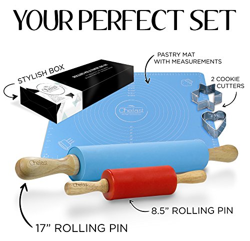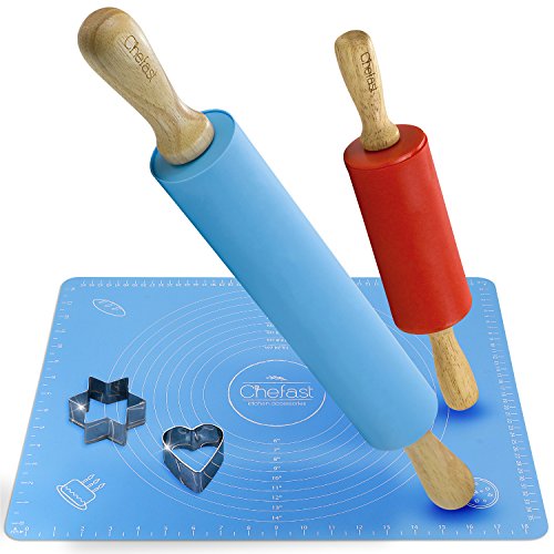Chefast Non-Stick Rolling Pin and Pastry Mat Set: Combo Kit of Large and Small Silicone Dough Rollers, Reusable Kneading Mat with Measurements, and 2 Stainless Steel Cookie Cutters for Baking